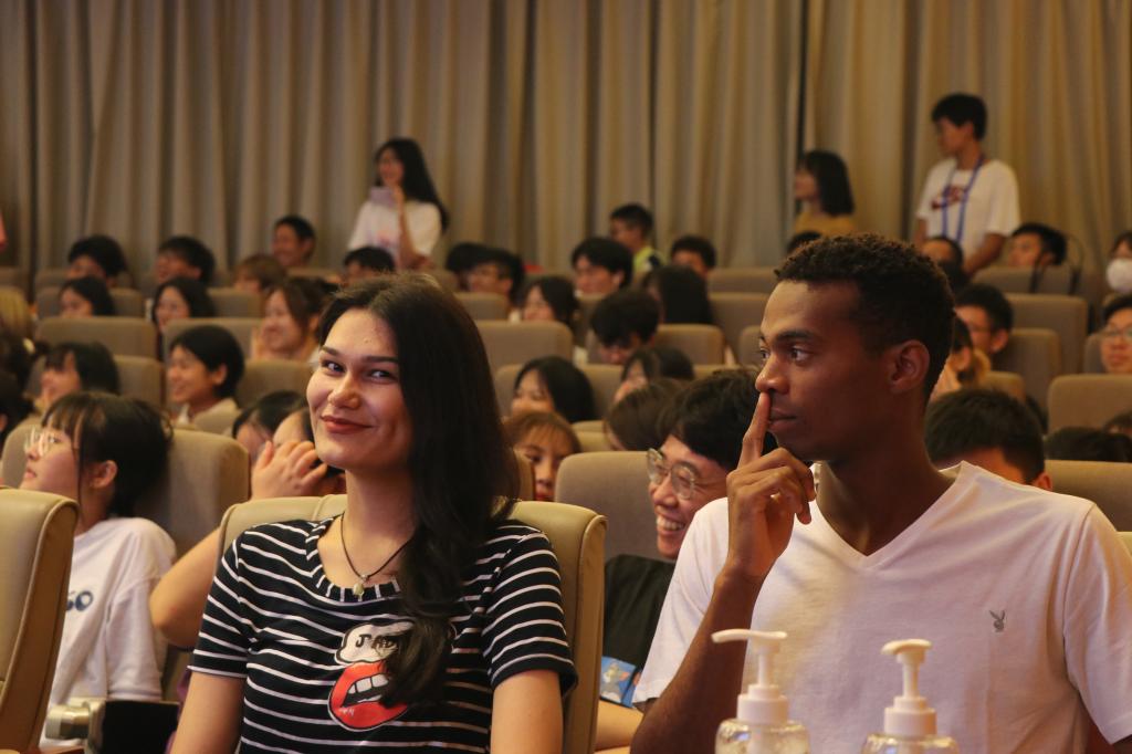 侧耳倾听、低头冥思、迅速作答,参赛团队无不严阵以待、沉着应战。“桃李春风一杯酒,江湖夜雨十年灯”“人面不知何处去,桃花依旧笑春风”……在成语接龙和飞花令环节,各个团队,你来我往,不甘示弱,选手之间配合默契,境内外学生团结协作、优势互补,展现出了良好的参赛风貌和友谊精神。比赛现场,观众朋友们也跃跃欲试,积极参与有奖互动,和参赛团队一起猜字谜、对诗词,满堂欢声笑语,其乐融融。