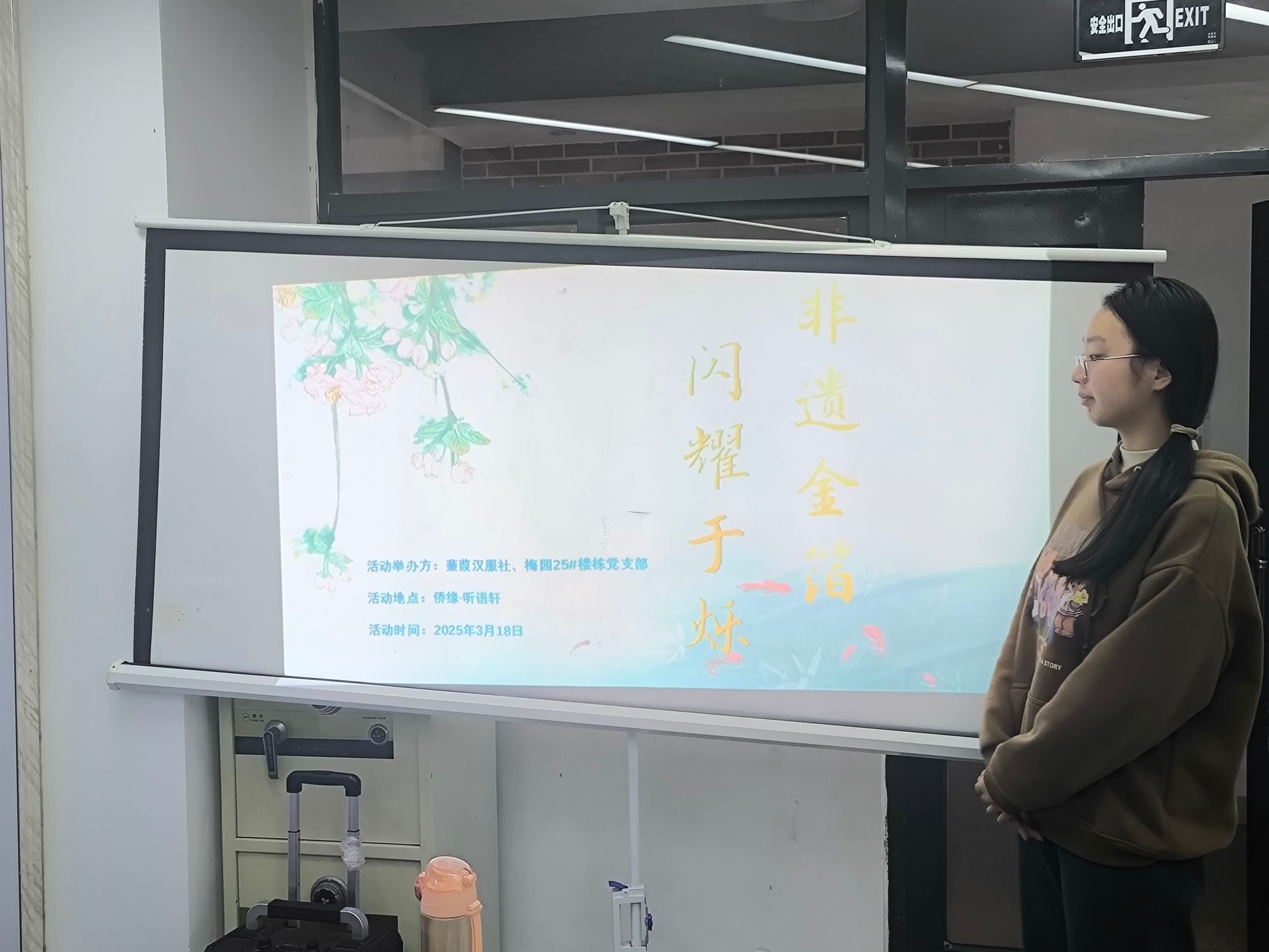 活动伊始,蒹葭汉服社负责人梁欣妍为各位同学进行知识讲解。作为第二批国家级非物质文化遗产代表,烧箔画最早可追溯及唐代。因其精湛的工艺、斑斓的色彩以及三维立体的视觉效果,在浩如烟海的传统艺术中脱颖而出,成为我国金属装饰加工工艺的璀璨明珠,承载了古人绝佳的审美追求。