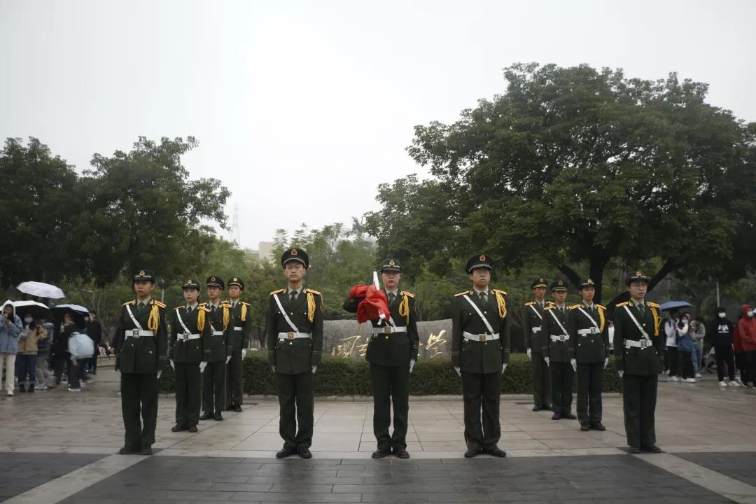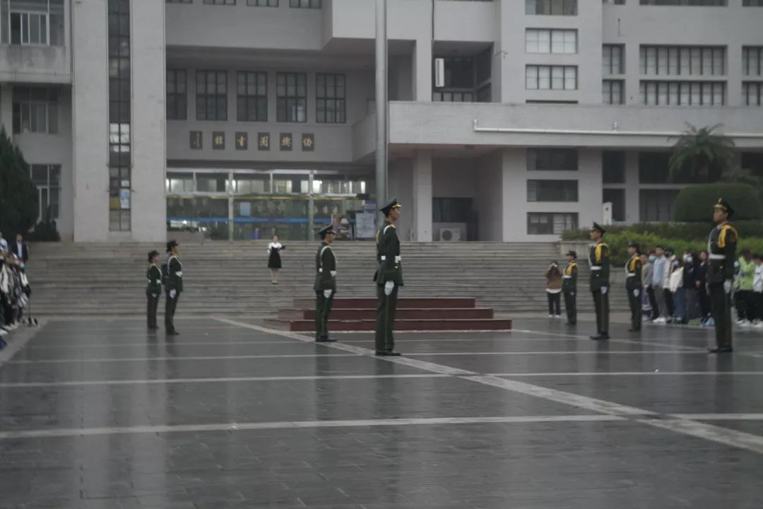 濛濛细雨中,国旗护卫队迈着稳健的步伐,护送五星红旗至国旗台前。国歌奏响,全体人员面向国旗肃立,随着冉冉升起的国旗随行注目礼。